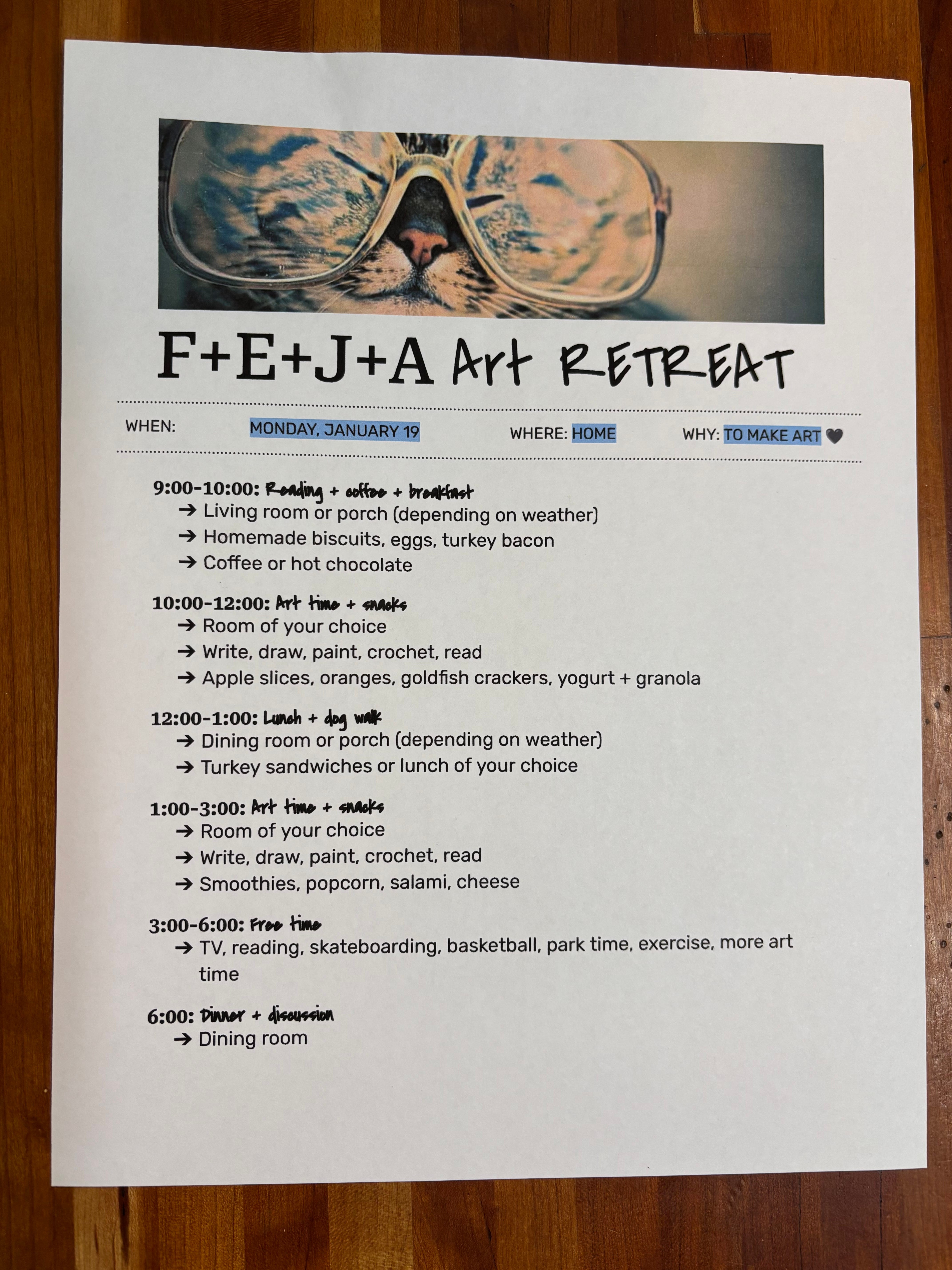We picked Monday, January 19, the day after my birthday, and a holiday, so no school or work would get in the way. I made a schedule, and we got to it.